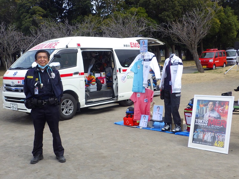 マスク着用も自己判断となって、Withコロナ政策が基本化してゆく中で、各地でイベントが再開される中、逗子消防・防災フェアに車両展示で出展。多忙な救急車の展示は予定されず、白い車が無いと寂しいねと友情参加。横浜消防局出初式でドラマ「東京MER」のERカー展示に対抗し、TBS・東宝の協力を受けて衣装を展示して来場者にリアル菜々緒さん変身体験をしてもらいました。