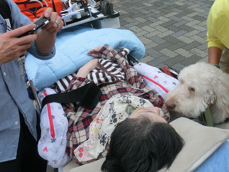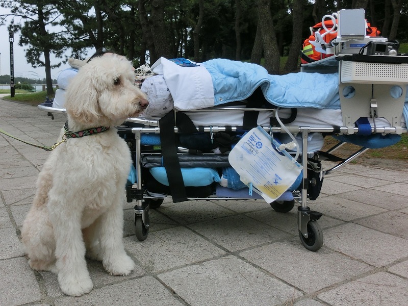 横浜市内の海浜公園で、鎌倉小町のアニマルセラピー事務所から派遣された大型犬と障害患者様のふれあいをアシスト。実はこのイベントは旦那様から入院中の妻への誕生日サプライズ。ストレッチャー上のまま一緒にリードを持って散歩をしていただき、院内ではあまり見ることの無いという笑みの時間が長く続きました。