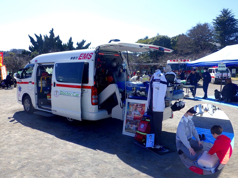 昨年同様、今年も実施された消防・防災フェア2024in逗子に有志で参加し、展示予定に無い救急車(休日は全車出場となるため)の身代わりとして車両展示を行いました。今回はコロナ解禁らしくキッチンカーもお目見えし、天候にも恵まれて午前中のみのイベントでも1000人以上の参加があり、予想を上回っててんてこ舞い状態。また、芸能人はじめての参加となるバラエティーしくじり先生で話題の『吉本興業 イシバシハザマ』の応援を受けて今までにない会場の盛り上がりを肌で実感しました。次回は救急予備車が配置されるため出番はないかもです。・・・