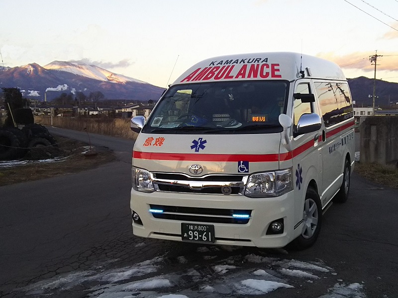 ご家族の希望により、専属看護師同乗による搬送となりました。搬送先にて、わずかな看護費用で救命士と看護師のペア搬送に驚きの声が上がりました。昭和の時代の懐かしい救急車が現役活動している姿にもびっくり。背後に眺められる浅間山からは珍しく煙が見え、翌日のニュースで警戒レベルアップと大雪が報じられました。